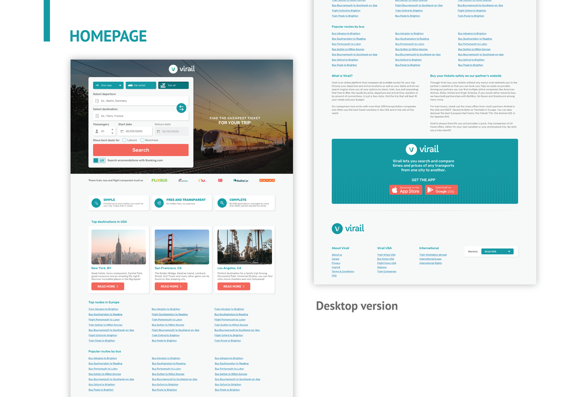 I got rid of the plain boring grey and, depending on the landing page, the image background would change. A big title informs the user what route they’re seeing in that page. The whole header was modified in the attempt of catching the user’s attention, hopefully it would create a bigger impact, and they would remember visiting Virail’s website.